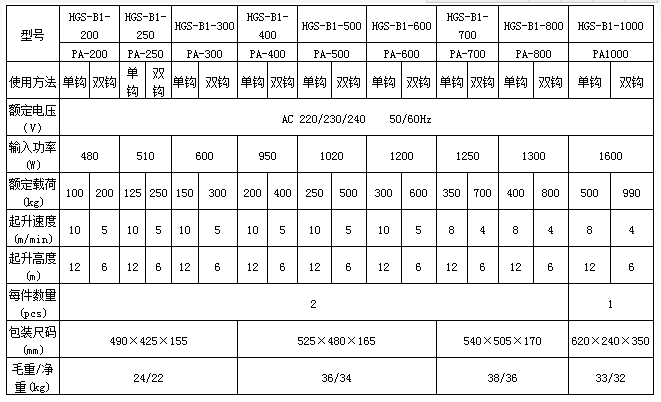 PA250微型電動葫蘆技術參數圖:
